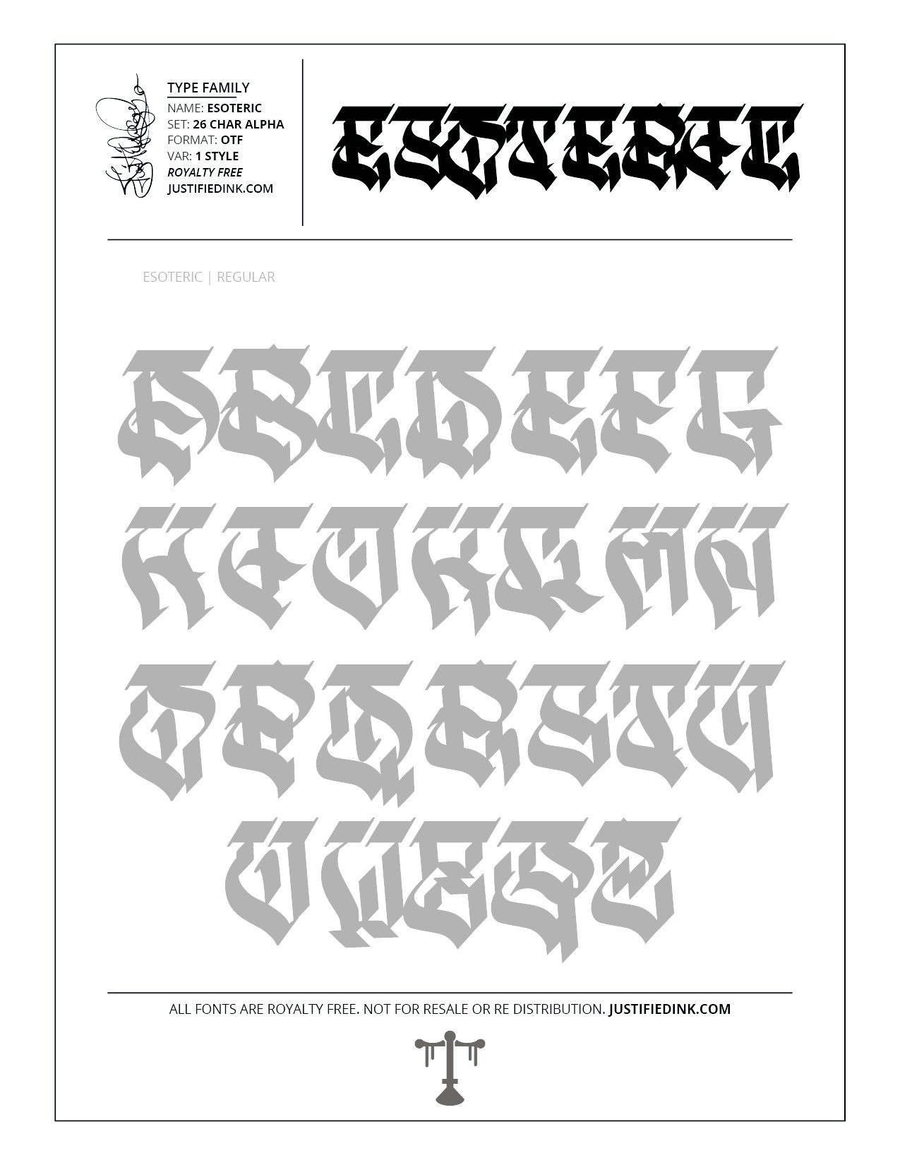 Esoteric is finding the small details in the arcane and bringing them to the surface. Requiring time in dark and uncomfortable space but ultimately emerging with gems and enlightenment. This font is dedicated to that process by which we all find deeper understanding and experience.