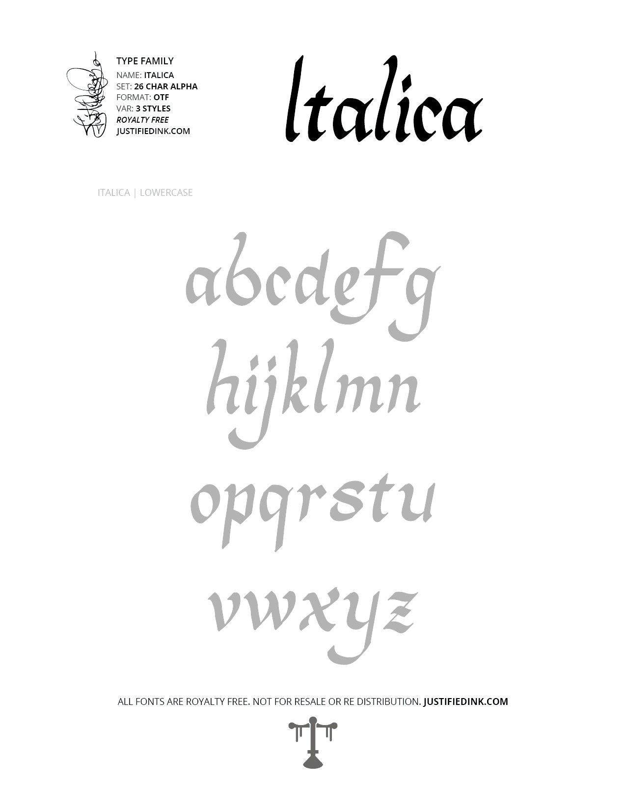 You dont have to be bold to be heavy metal. Italica - an Italic script, is also known as chancery cursive and Italic hand. Known for its semi-cursive, slightly sloped style of handwriting and calligraphy that was developed during the Renaissance in Italy.