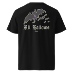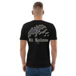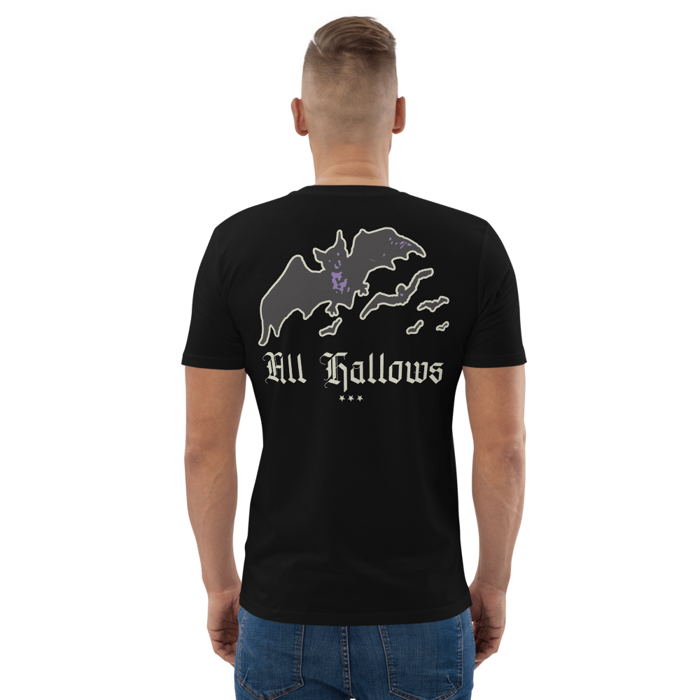 A gothic Halloween design titled ‘All Hallows’ featuring retro bats in flight and bold blackletter typography. Perfect for fans of gothic art, occult symbols, vintage Halloween, and dark retro style.”