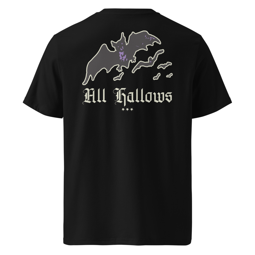 All Hallows—gothic lettering carries the weight of saints and shadows, while bats wheel above like keepers of the night. A reminder that sanctity and hunger often share the same sky.