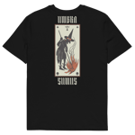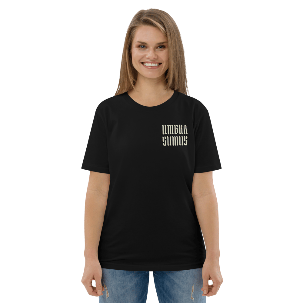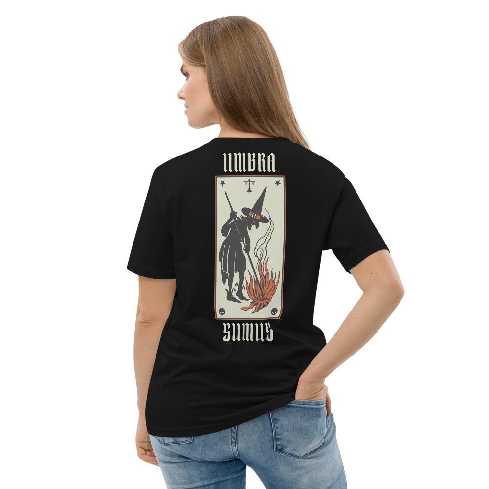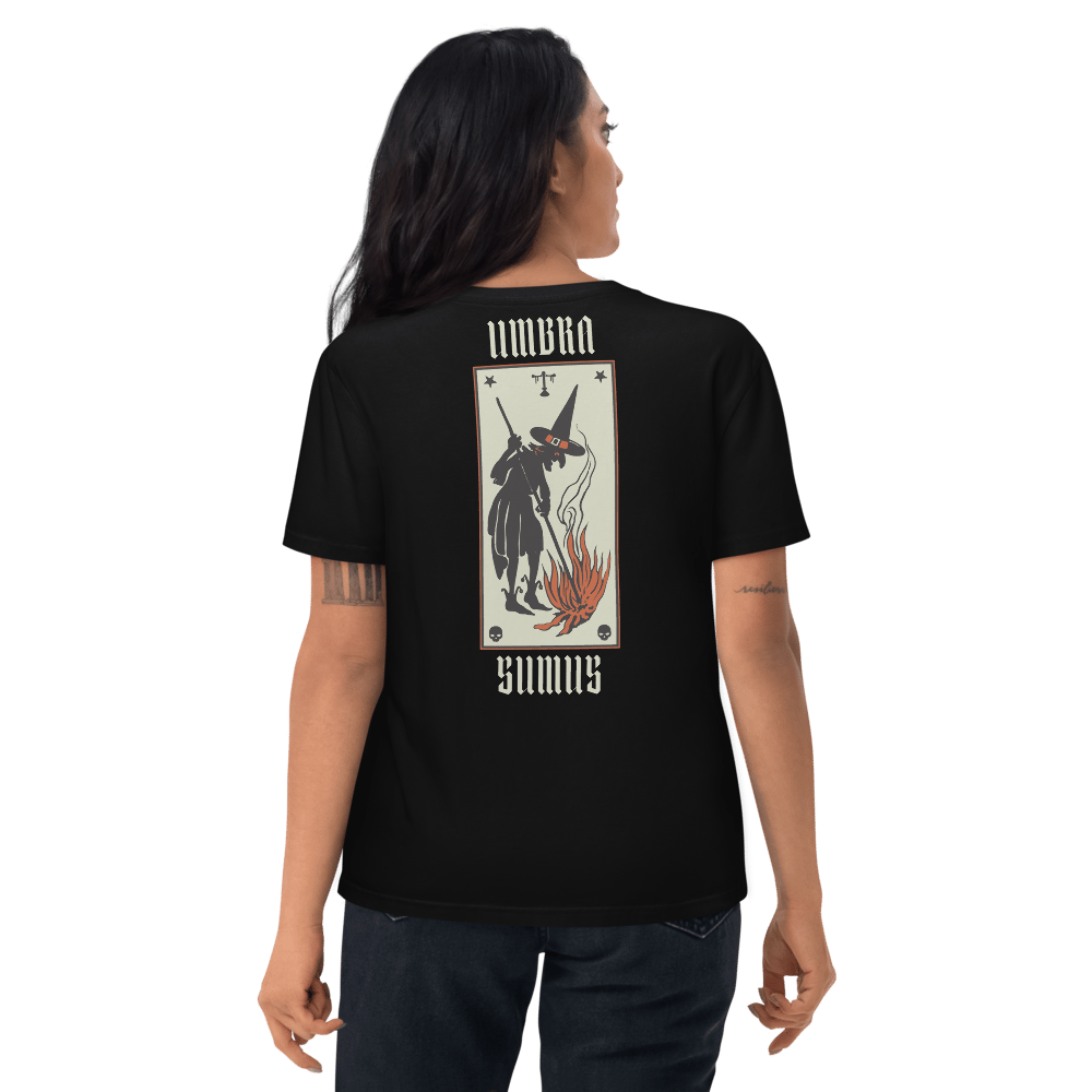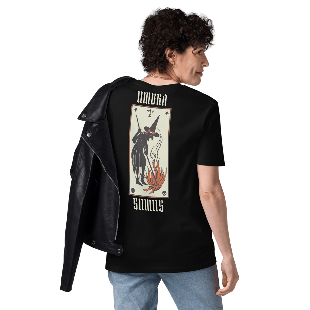 ‘Umbra Sumus’—we are but shadows. This design channels the mystique of a tarot card, featuring a retro witch in ritual motion, broom stirring the fire as symbols frame her fate. A reminder that within every flame, shadow is cast. Perfect for lovers of witchcraft, tarot, and vintage Halloween-inspired gothic art.