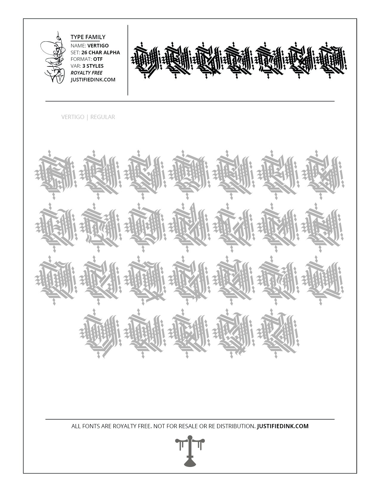 Vertigo is the stability and the uncertainty composed through maximalist blackletter. The variations are spun on the central point for use in future-style design.